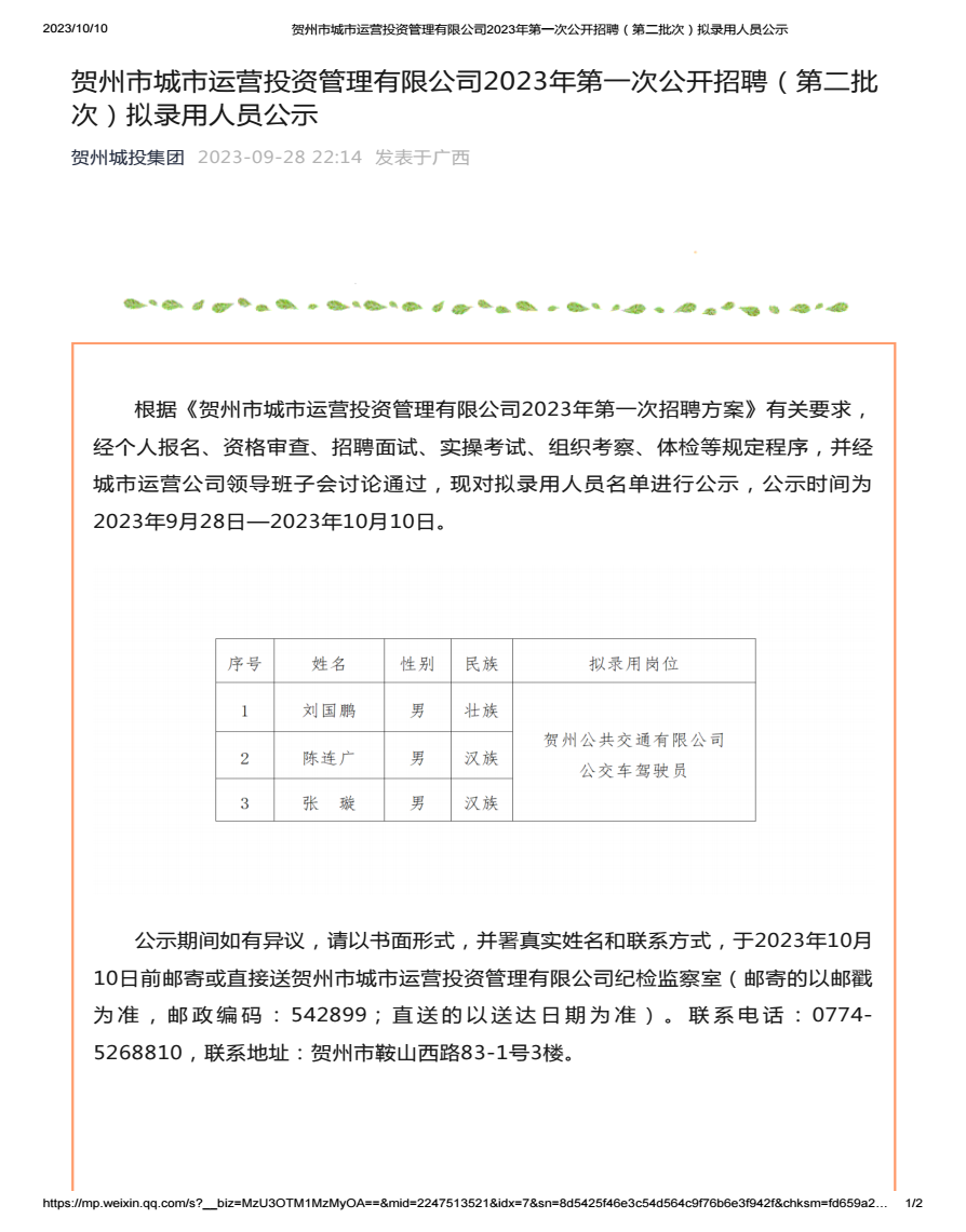 賀州市城市運營投資管理有限公司2023年第一次公開招聘(第二批次)擬錄用人員公示2023-09-28