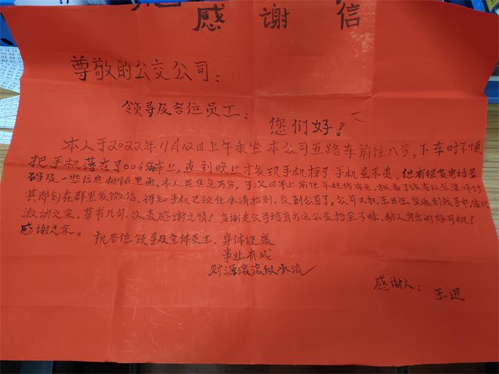 【清廉城投】清風(fēng)公交伴我行,拾金不昧暖人心2022-11-20得知手機(jī)已被任師傅拾到,值此激動之余,草書幾句,以表感謝之情!多謝貴公司培育出這么多拾金不昧,助...
